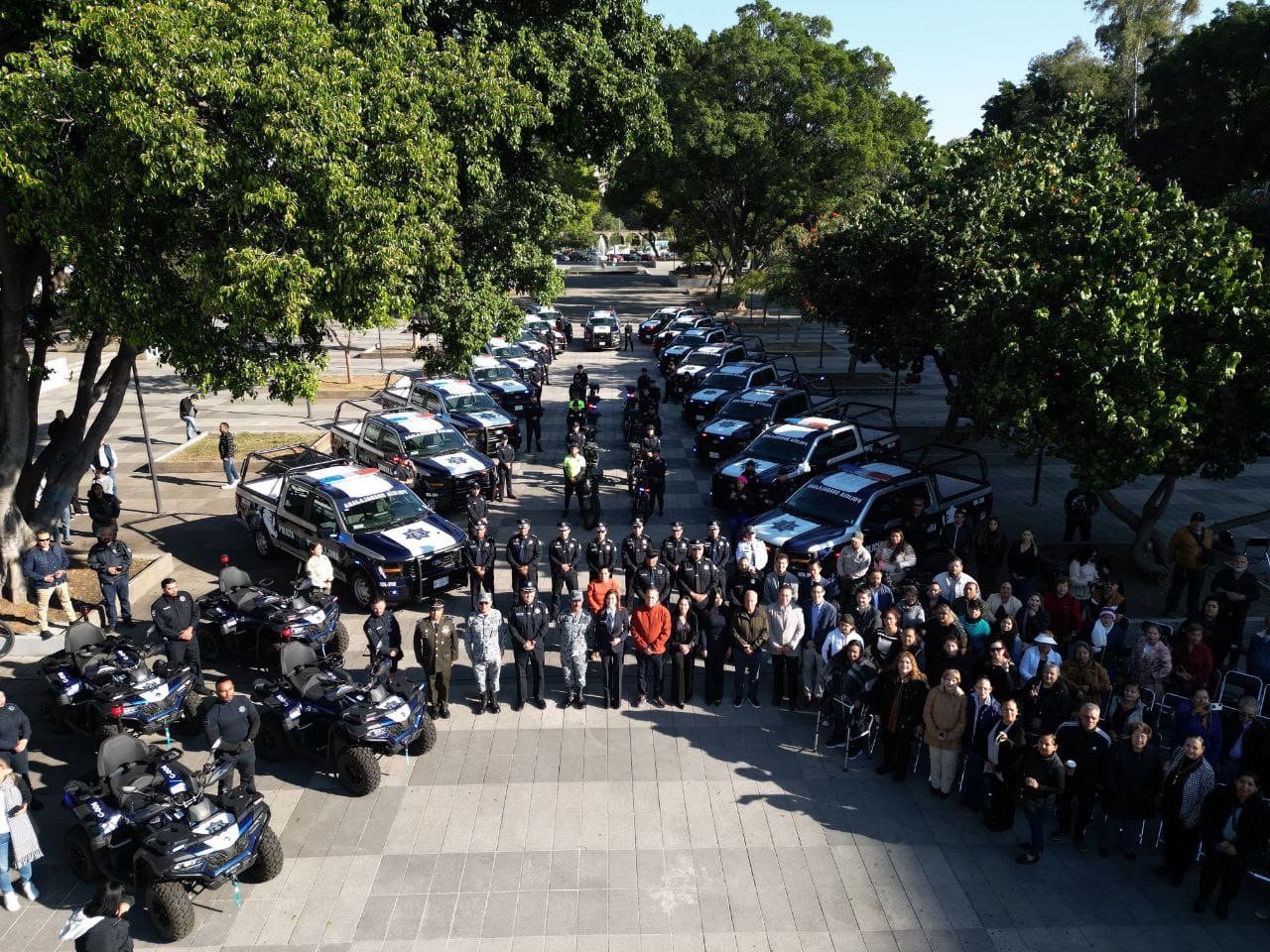 Durante el acto encabezado por la presidenta municipal, Vero Delgadillo, se incorporaron 26 patrullas tipo pick up de doble cabina, 12 bicicletas eléctricas, ocho cuatrimotos, dos drones con tecnología térmica, así como 350 radios de comunicación y 350 baterías adicionales, herramientas que permitirán ampliar la presencia policial y mejorar la respuesta en distintos puntos del municipio.