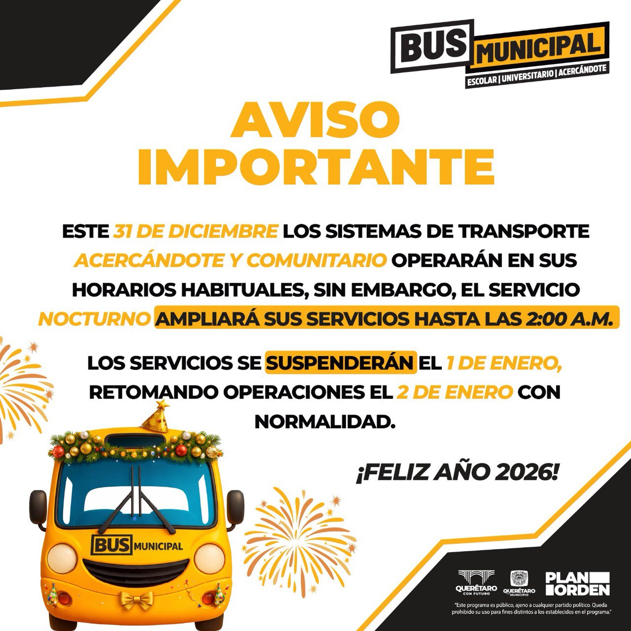 Con motivo de los festejos de fin de año y ante el aumento en la movilidad urbana, el Municipio de Querétaro, a través de la Secretaría de Movilidad, informó que el Sistema de Transporte Nocturno Gratuito operará con horario extendido la noche del 31 de diciembre de 2025 y la madrugada del 1 de enero de 2026.