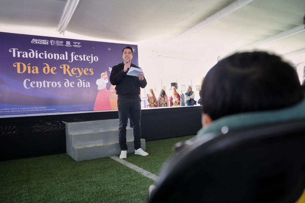 El presidente municipal de Querétaro, Felifer Macías, participó en la celebración del Día de Reyes organizada por el Sistema Municipal DIF para 150 niñas y niños que asisten a los Centros de Día Njhöya, Jädi y Meni.