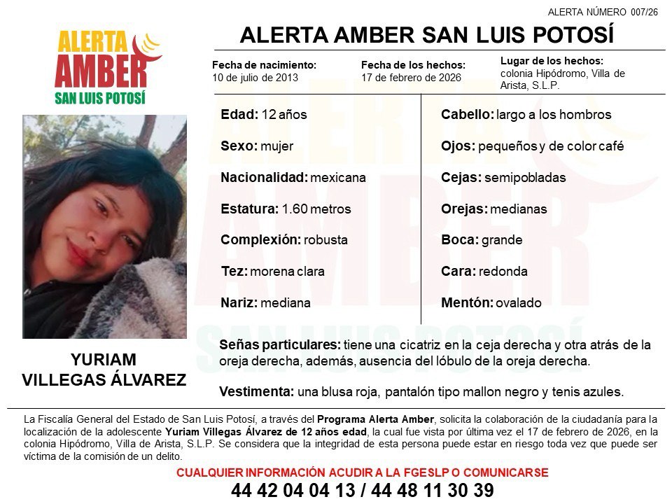 La Fiscalía General del Estado de San Luis Potosí (FGESLP) activó una ficha de Alerta Amber para la localización de Yuriam Villegas Álvarez, quien tuvo contacto por última vez con sus familiares el 17 de febrero de 2026, en la colonia Hipódromo, de Villa de Arista.