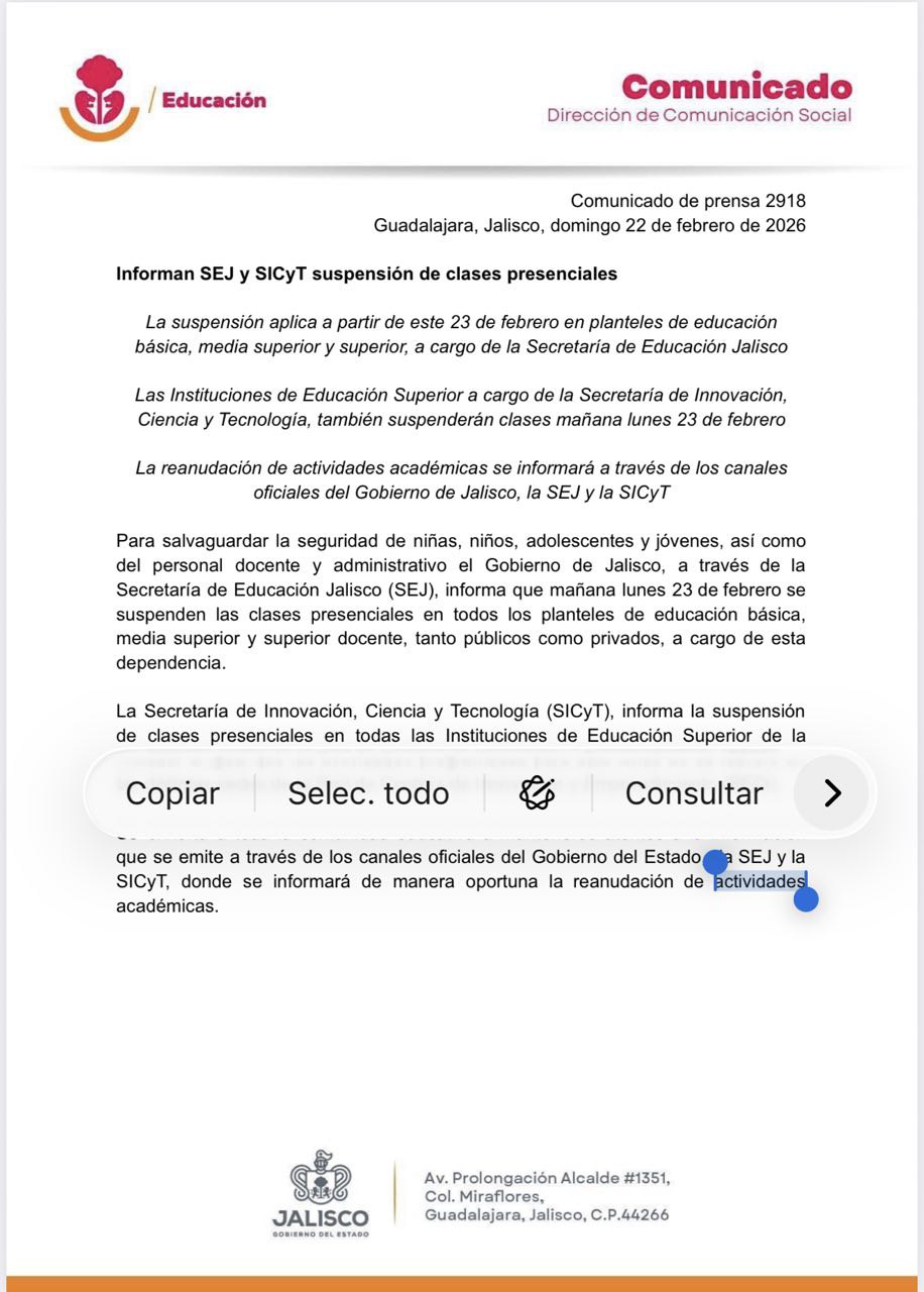 El Gobierno de Jalisco informó la suspensión de clases presenciales en todos los niveles educativos para este lunes 23 de febrero, como medida preventiva para salvaguardar la integridad de la comunidad escolar, luego de los hechos de violencia registrados en distintas regiones del estado tras el operativo federal realizado en Tapalpa.