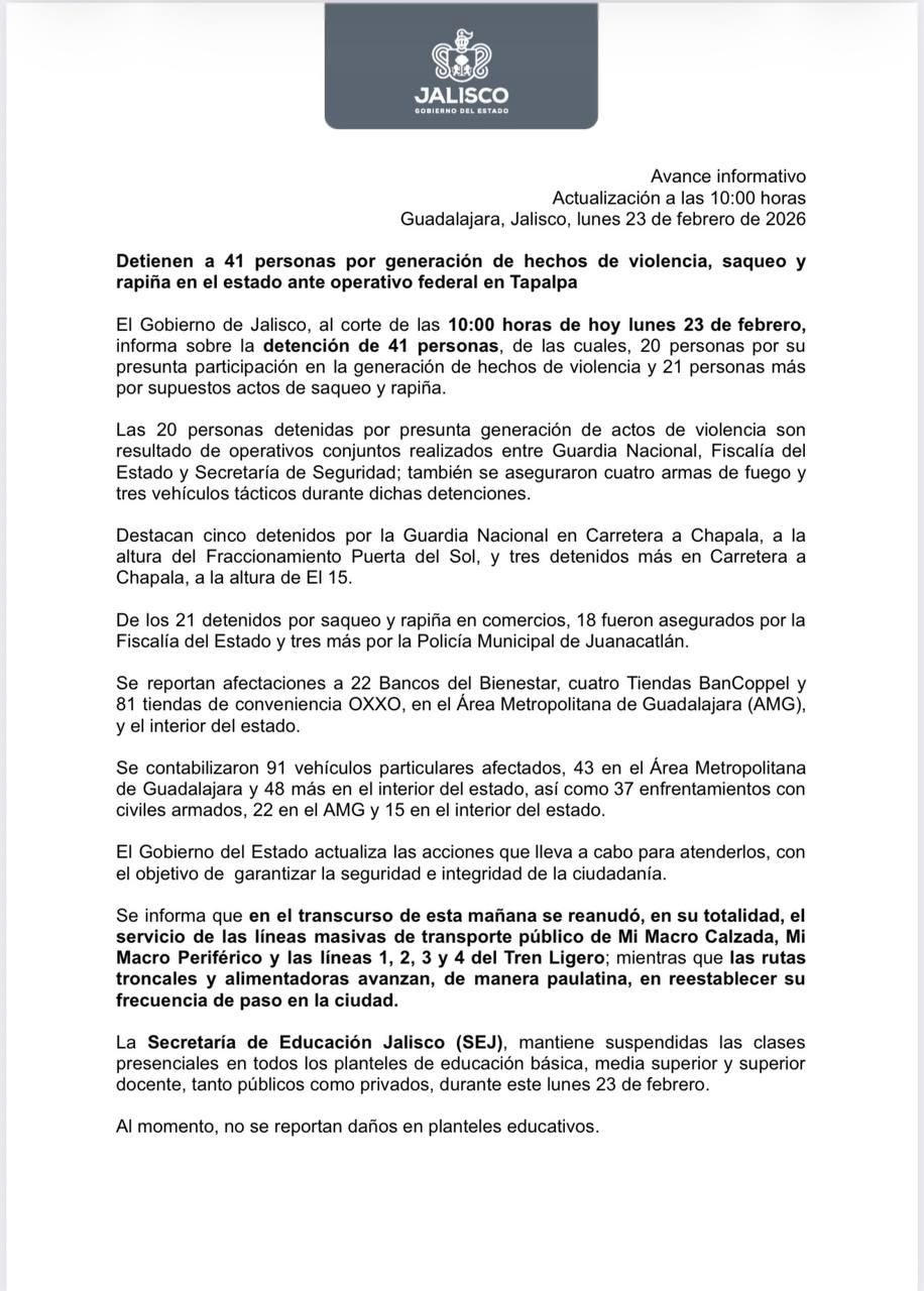 El Gobierno de Jalisco informó que, al corte de las 10:00 horas de este lunes 23 de febrero, fueron detenidas 41 personas relacionadas con hechos de violencia, saqueo y rapiña registrados en distintos puntos del estado, en el contexto del operativo federal realizado en el municipio de Tapalpa.