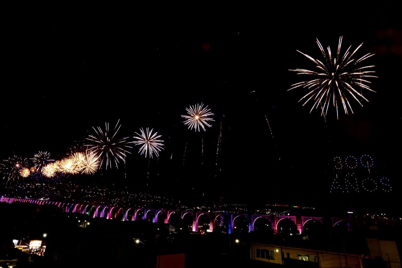 La jornada se desarrolló a lo largo de cinco escenarios instalados sobre la Calzada de los Arcos, donde familias y visitantes disfrutaron de presentaciones musicales y culturales encabezadas por talento local. La conmemoración cerró con un espectáculo de luces, sonido y drones en honor a uno de los monumentos más representativos de la ciudad.